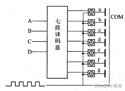 ͼ3ËùʾÊÇÆß¶ÎÒº¾§ÏÔʾÆÁµÄµç¼«ÅäÖú;²Ì¬Çý¶¯µç·ͼ¡£Æß¶Î¹²ÓÃÒ»¸ö±³µç¼«COM£¬Ç°µç¼«a¡¢b¡¢c¡¢d¡¢e¡¢f¡¢g»¥Ïà¶ÀÁ¢£¬Ã¿¶Î¸÷¼ÓÒ»¸öÒì»òÃŽøÐÐÇý¶¯¡£
