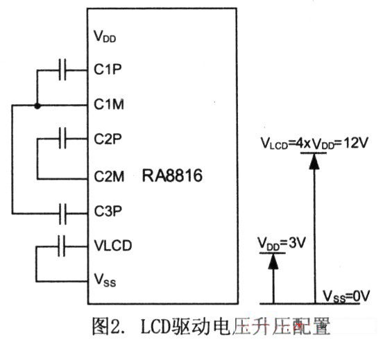 LCDÇý¶¯·½Ê½¼°Ãæ°å²ÄÖʵIJ»Í¬£¬ËùÐèÒªµÄÇý¶¯µçѹÊDz»Í¬µÄ£»ÔÚʵ¼ÊÓ¦ÓÃϵͳÖУ¬ÏµÍ³ÄÜÌṩµÄµçѹҲÊÇÓвîÒìµÄ¡£ÕâÒªÇóLCDÇý¶¯Ð¾Æ¬ÓнϿíµÄµçѹ¹¤×÷·¶Î§£¬RA8816ÄÚÖÃÓв½½øÉýѹµç·£¬¿ÉÒÔ²úÉú4±¶¡¢3±¶»ò2±¶ÓÚ(VDD—VSS)µçѹµÄLCDÇý¶¯µçѹ-VLCD£¬¸Ãµçѹ¹©¸øµçѹµ÷ÕûÆ÷¼°ÄÚ²¿LCDÇý¶¯µç·ʹÓá£ÈôÔÚC1PÓëC1M¿ç½ÓÒ»¸ö1μF×óÓҵĵçÈÝÔòÄܲúÉú2±¶ÓÚ(VDD—Vss)µçѹ£»ÈôC2PÓëC2MÒ²¿ç½ÓÒ»¸öl μF×óÓҵĵçÈÝÔò²úÉú3±¶ÓÚ(VDD—Vss)µçѹ£»ÈôÒª²úÉú4±¶ÓÚ(VDD—Vss)µçѹ£¬Ôò»¹ÒªÔÚC3PÓëC1M¼ä¿ç½ÓÒ»¸öl μF×óÓҵĵçÈÝ£¬Èçͼ2Ëùʾ¡£RA8816Áé»îµÄVLCD²úÉú·½Ê½£¬Ê¹µÃÆäÄܹ»Çý¶¯²»Í¬²ÄÖʵÄLCDÃæ°å¡£