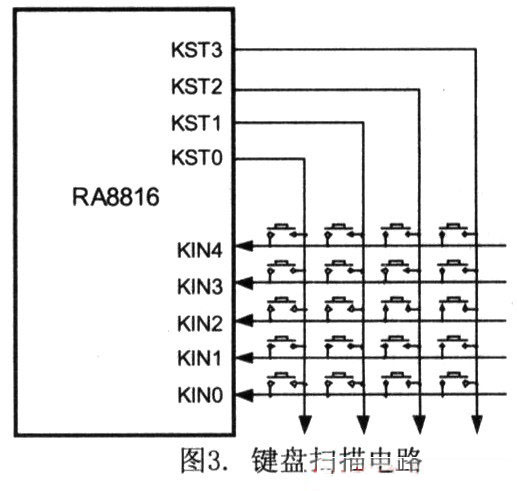 ÖÐÎĵãÕóÒº¾§ÏÔʾÇý¶¯Æ÷RA8816µÄϵͳʱÖÓÓÉÒý½ÅCLK_SELµÄ״̬À´È·¶¨£¬CLK SELΪ¸ßµçƽʱ£¬ÏµÍ³Ê±ÖÓÓÉÄÚ²¿RCÕñµ´µç·²úÉú£»CLK SELΪµÍµçƽʱ£¬ÏµÍ³Ê±ÖÓÐèÍâµç·Ìṩ²¢´ÓEXT CLKÒý½ÅÊäÈë¡£RA8816µÄ¾ØÕó¼üÅÌɨÃè½Ó¿ÚÓ¦ÓÃÆðÀ´·Ç³£·½±ã£¬Ö»Òª½«KsT[3£®£®0]ÐÐɨÃèÊä³öºÍKIN[4£®£®0]ÁÐÊäÈëÐźŽÓÉÏÏàÓ¦µÄ°´¼ü£¬Èçͼ3Ëùʾ£¬²¢Í¨¹ýÏàÓ¦ÃüÁî¼Ä´æÆ÷µÄÉèÖþÍÄÜÕý³£¹¤×÷¡£µ±Óа´¼ü°´ÏÂʱ£¬Òý½Å»á²úÉúÖжÏÐźţ¬ÏµÍ³¿ØÖÆÆ÷¾Í¿ÉÒÔͨ¹ý¿ØÖÆ×ÜÏß½Ó¿Ú¶ÁÈëÏàÓ¦µÄ¼üÂë¡£
